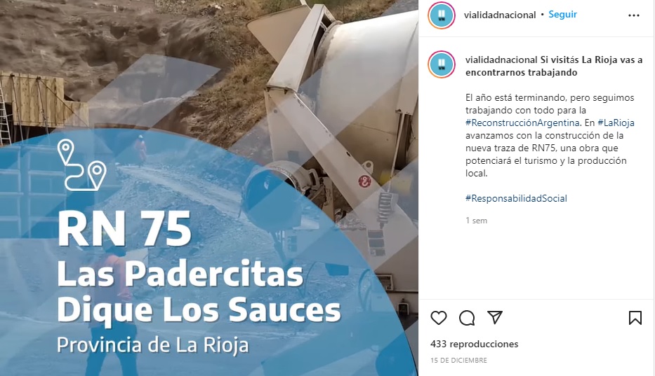 Acerca de nuestra obra en RN 75, Las Padercitas – Dique los Sauces publicaron en Instagram y Facebook: